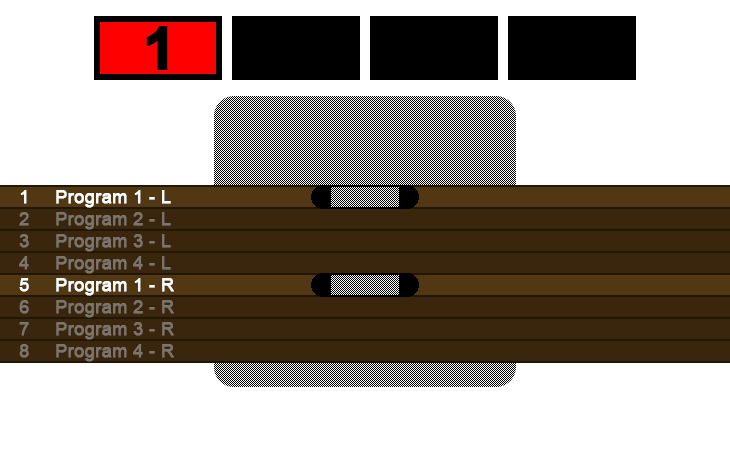 For å forklare det litt bedre har jeg lagd animasjonen nedenfor som viser hvordan båndet er delt inn i 8 ulike spor og 4 forskjellige program. Samtidig ser du hvordan lydhodet flytter seg opp og ned under avspilling av de forskjellige spor og programmer.